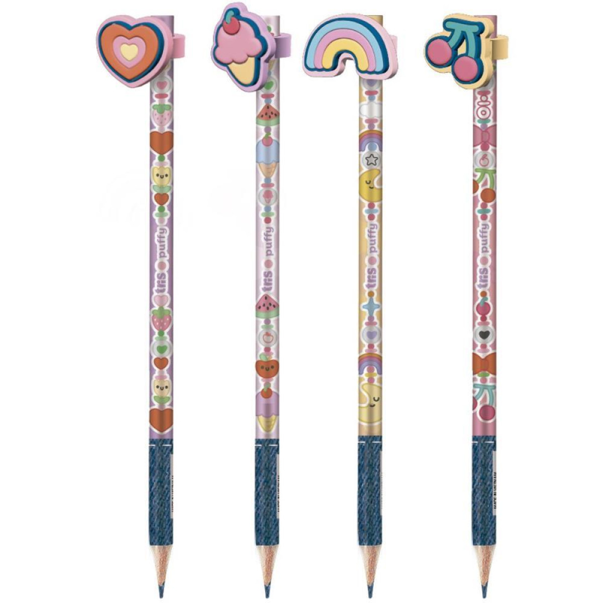 Inspirada nos pingentes e micangas que estao em alta, a colecao Charm conta com cores alegres e design divertido. E perfeita para customizar e criar memorias especiais com os amigos! O lapis grafite Puffy tem topper de silicone exclusivos, corpo redondo e 4 estampas tematicas.