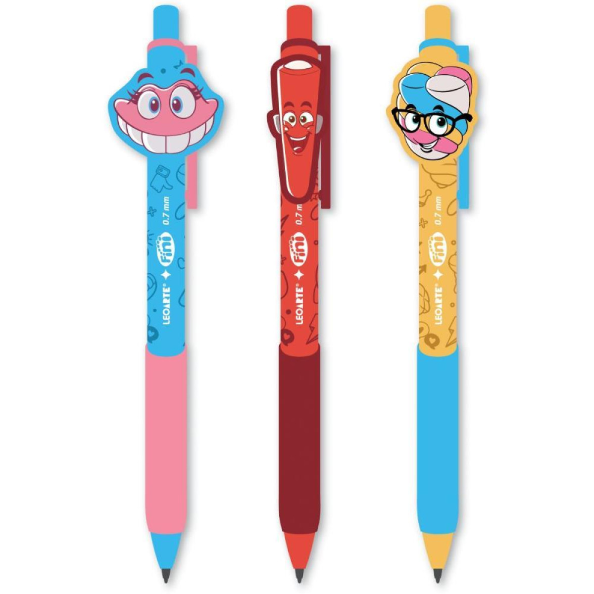 Lapiseira 0.7mm Fini 3 Cores Lapiseira grafite; Ponta: 0.7mm; Com aplique de silicone estampado; 3 artes diferentes no display