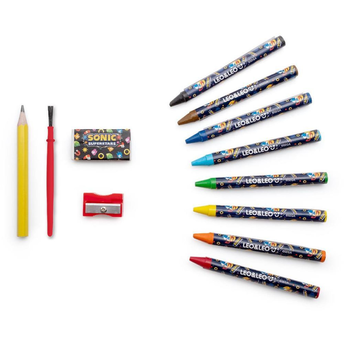 Estojo completo com 12 cores de aquarela, 8 pecas de giz de cera, 1 pincel, 1 lapis, 1 borracha macia e 1 apontador;