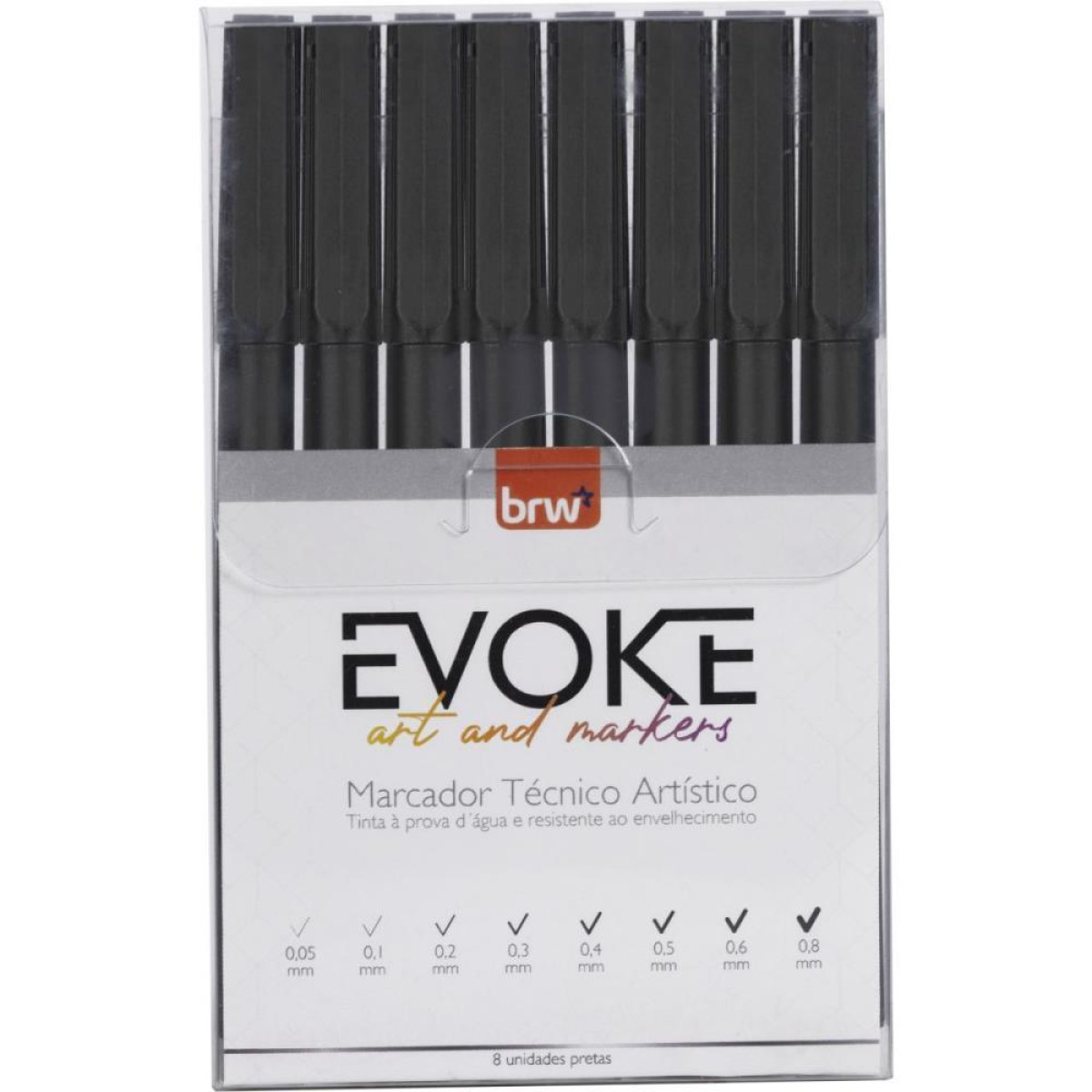 O MARCADOR ARTISTICO TECNICO VEM EM UMA EMBALAGEM COM 08 MARCADORES, TEM CORPO LEVE E ERGONOMICO PARA FACIL MANUSEIO, TEM A TINTA PRETA E POSSUI 08 GRADUACOES DE PONTAS: 0,05, 0,1, 0,2, 0,3, 0,4, 0,5, 0,6 E 0,8. CLIP PLASTICO.