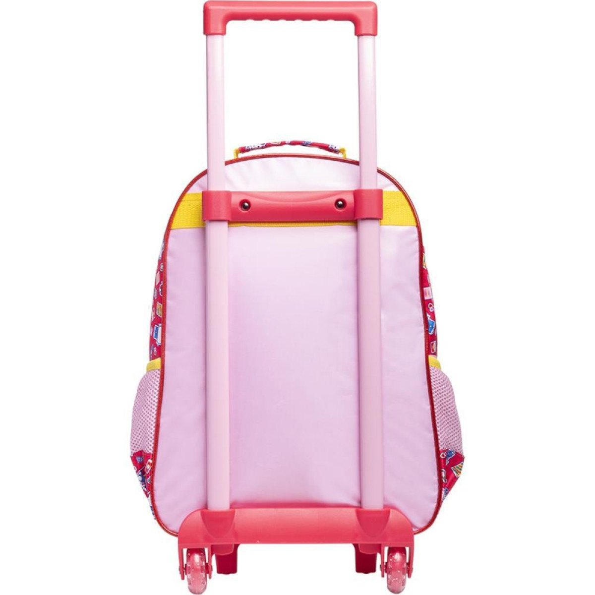 Mochila infantil com rodas tamanho G Hello Kitty..Altura de 40cm tamanho da mochila.Confeccionada em cetim de poliester; detalhe ; possui dois bolsos laterais em mesh para garrafas; hastes do carrinho em aco com regulagem de altura; rodas em material resistente e silencioso; ziper "trator" e puxadores persoanalizados em material emborrachado com icones da personagem; cobre ziper para proteger o ziper de chuvas.Estampaem pelucia e paetes laco Produto Licenciado Original.