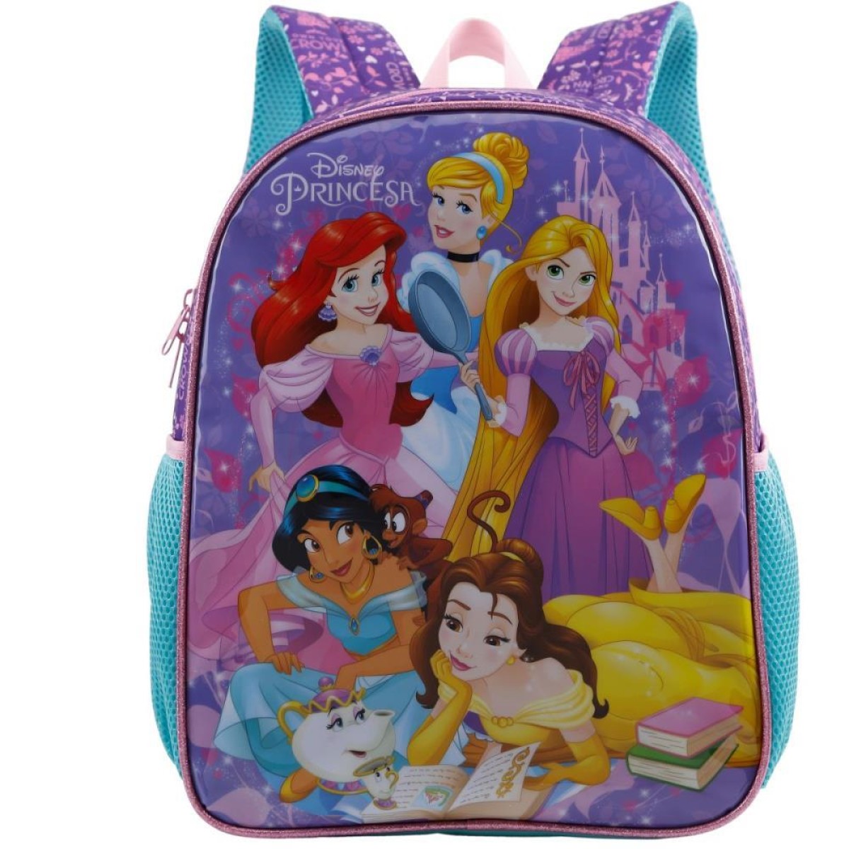 Em tamanho 12", produzida em poliester resistente e estampado. Painel frontal PVC Cristal - Compartimento principal amplo, 2 bolsos laterais mesh, ziper com puxadores simples, alca de mao em nylon e piping com glitter . Alcas acolchoadas com regulagem de tamanho para maior conforto.