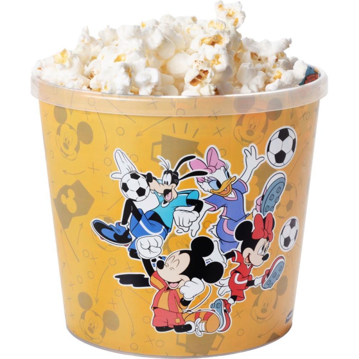 Pipoqueira balde com decoracao interna e externa do Mickey Futebol 2026. Capacidade 2,1 litros. E um pote fabricado em plastico atoxico, livre de BPA e resistente. Decoracao injetada no plastico, nao adesivada.