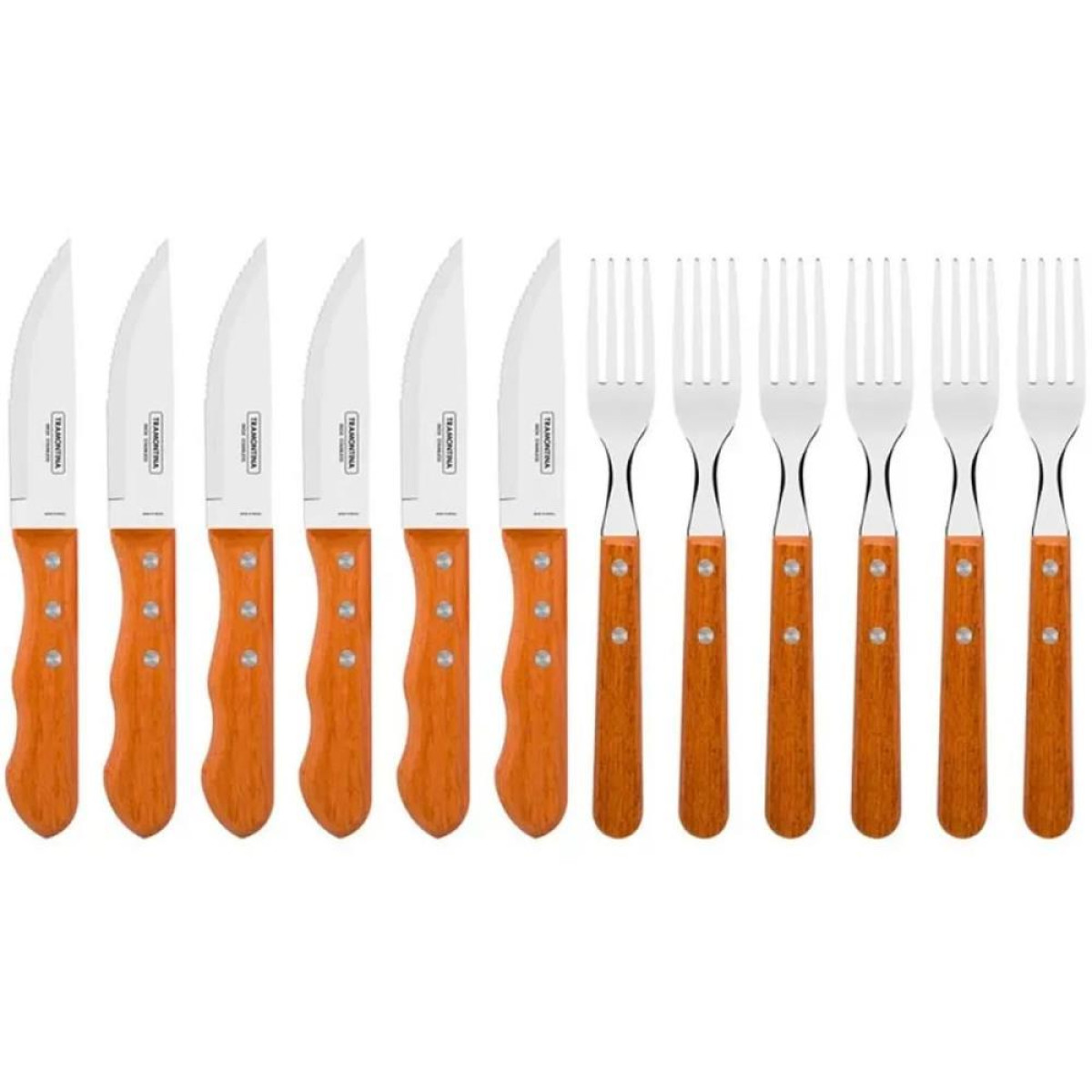 Para saborear aquele churrasco especial com a familia e os amigos, conte com o jogo para churrasco Tramontina Dynamic com laminas em aco inox e cabos de madeira natural 12 pecas. Desenvolvido para lhe proporcionar praticidade e beleza a sua mesa, ele tem pecas produzidas com laminas em aco inox, onde as facas tem maior durabilidade em seu fio de corte devido ao tratamento termico e os garfos contam com maior resistencia devido a estampagem. Seus cabos sao em madeira natural e contam com rebites de aluminio que os deixam com um belissimo design. Escolha seu corte de carne preferido e compartilhe sua mesa com a Tramontina!