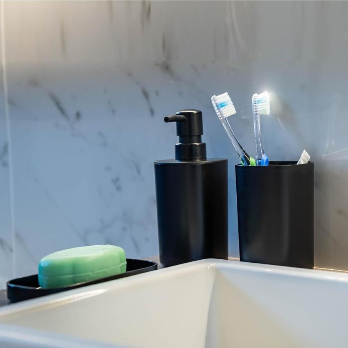 Conjunto para Banheiro com 3 Pecas Saboneteira, Porta Escovas e Dispenser, Cor Preta, Linha My Day, Ordene