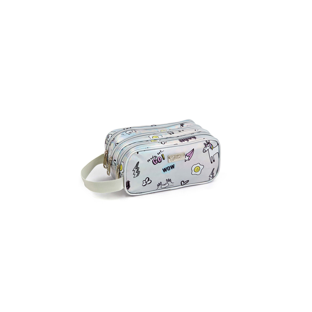Estojo triplo feminino Seanite 41343 é confeccionado em poliéster resistente, com três compartimentos amplos, zíperes duplos e design compacto, perfeito para organizar canetas, lápis de cor e demais itens escolares.