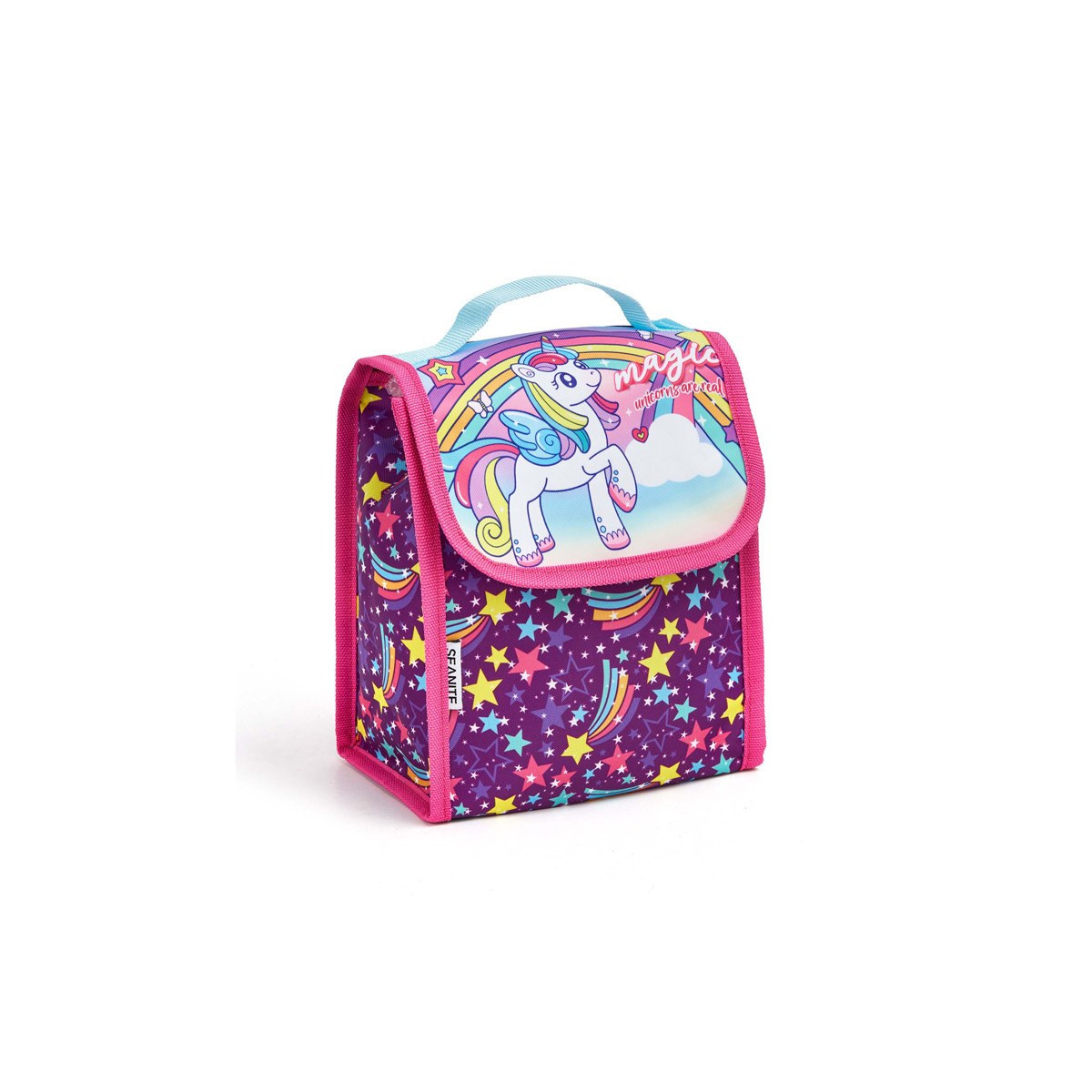 Lancheira térmica infantil feminina Seanite 42099 oferece revestimento térmico, bolso frontal com zíper e alça de mão — ideal para transportar alimentos com praticidade.