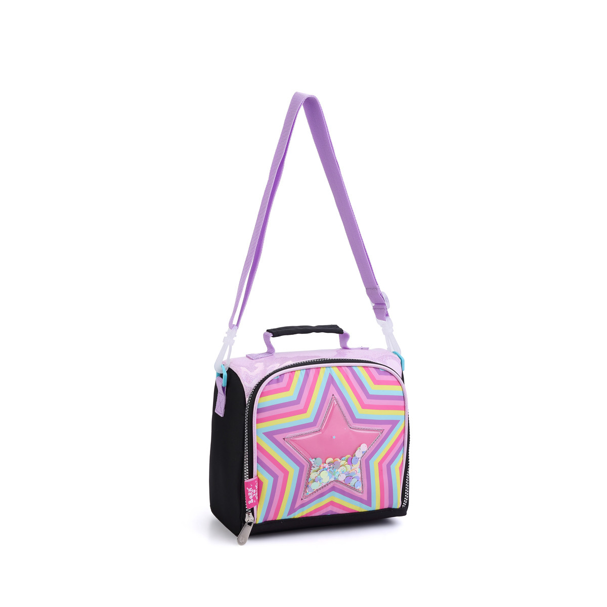 Lancheira térmica infantil feminina Seanite 43213 possui isolamento interno em alumínio, bolso frontal e alça de mão acolchoada — mantém alimentos frescos e fáceis de transportar.