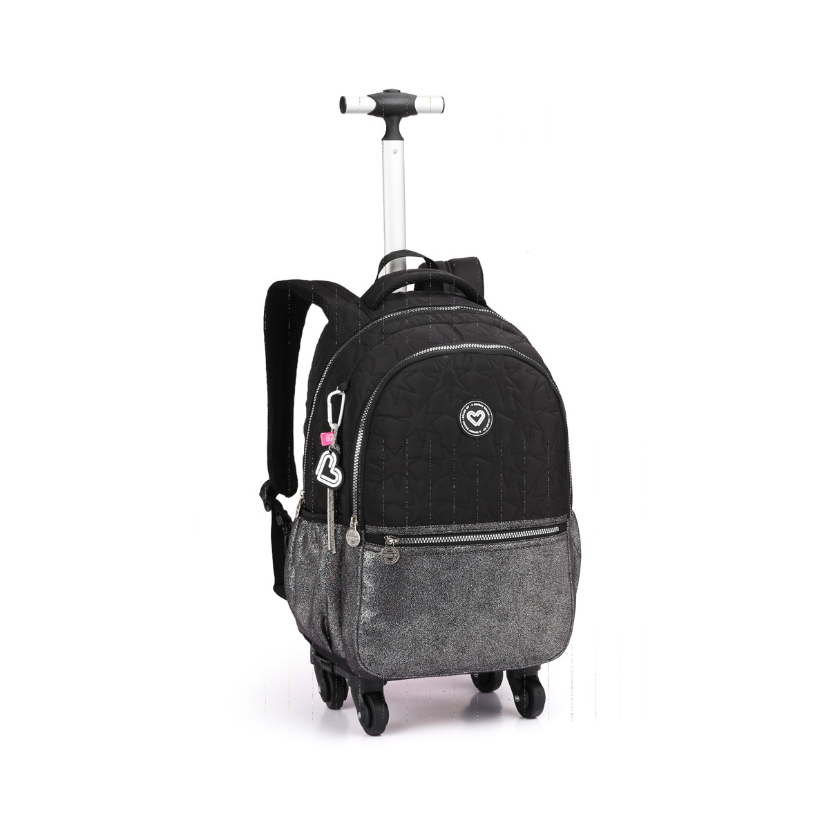 A mochila feminina 18″ com rodas Seanite 42212 traz rodas e puxador retrátil — ideal para transportar materiais escolares com facilidade.