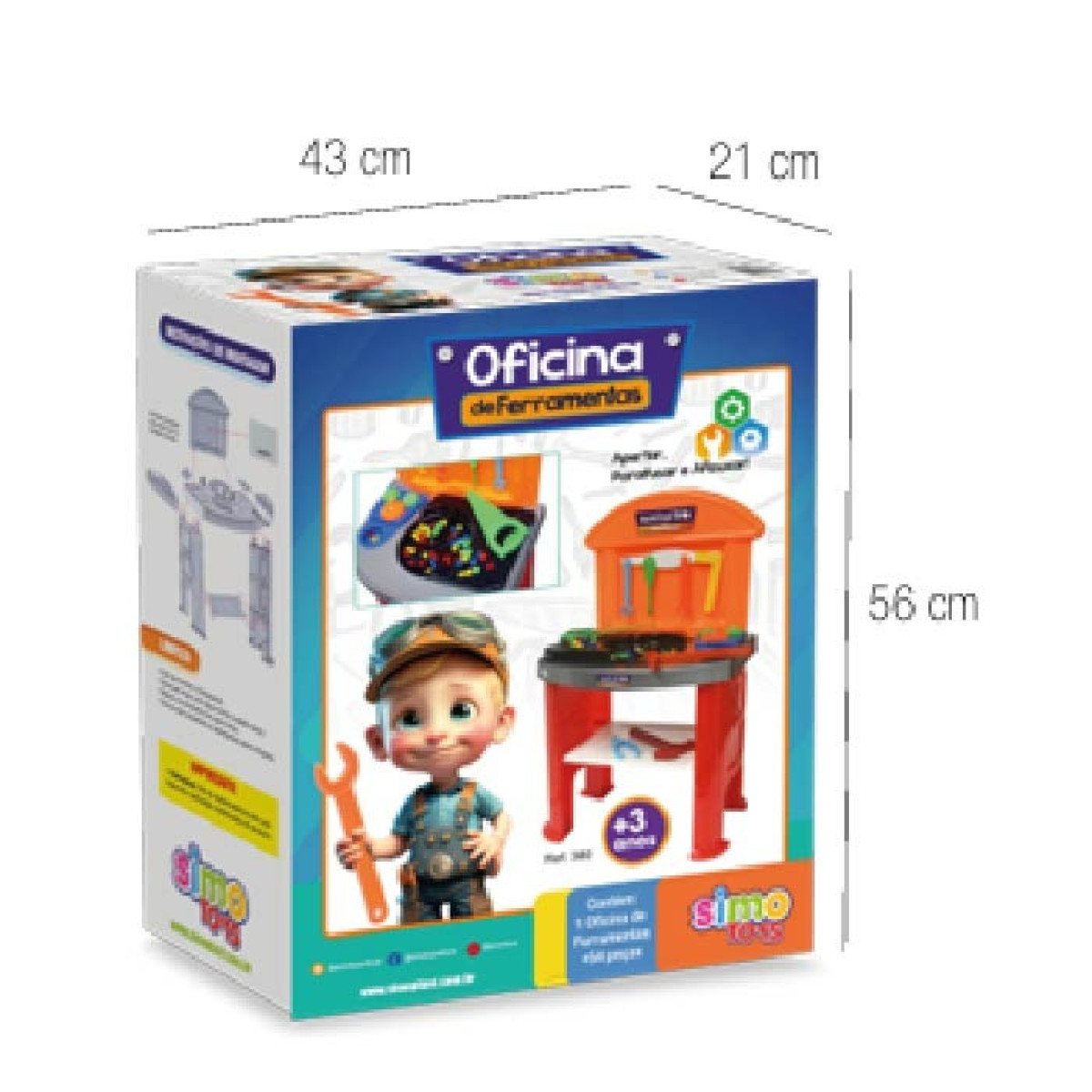 A Oficina de Ferramentas Infantil da Simotoys vem com bancada, ferramentas e peças para simular montagem e consertos. Ideal para incentivar a coordenação motora, criatividade e faz de conta. Produto com forte apelo visual no PDV.